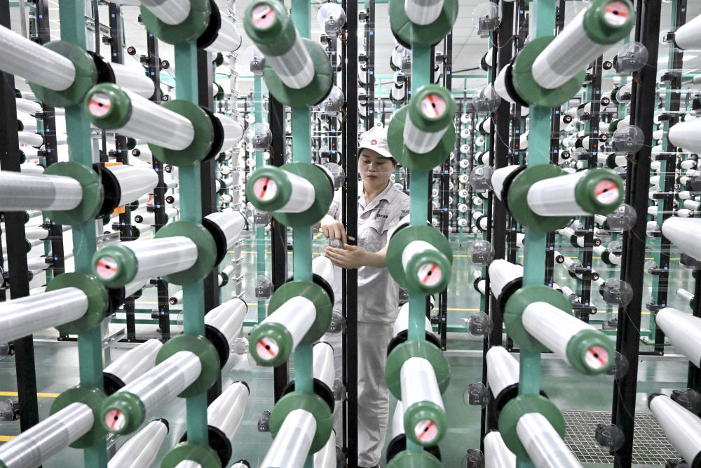 2月22日,在位于河南安陽林州市的河南光遠(yuǎn)新材料股份有限公司電子布準(zhǔn)備車間,工作人員在檢查整經(jīng)機(jī)機(jī)臺(tái)。新華社記者 李安 攝