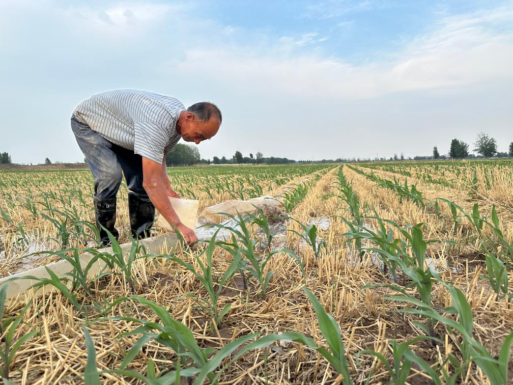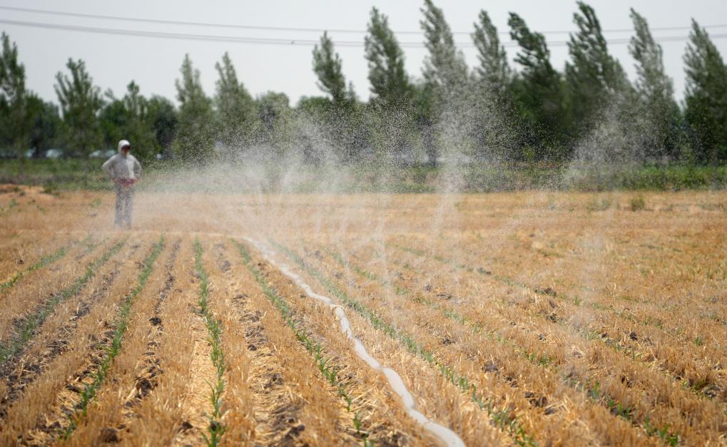 6月18日,在山東省菏澤市巨野縣麒麟鎮(zhèn)一處農(nóng)田,農(nóng)民江福華在灌溉玉米。新華社記者 王陽 攝