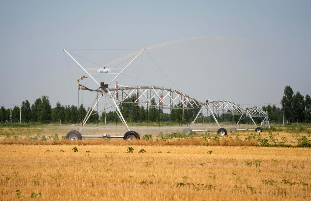 6月19日,在山東省高青縣青城鎮(zhèn),一臺大型農(nóng)用澆灌設(shè)備用黃河水澆灌農(nóng)田。新華社記者 徐速繪 攝