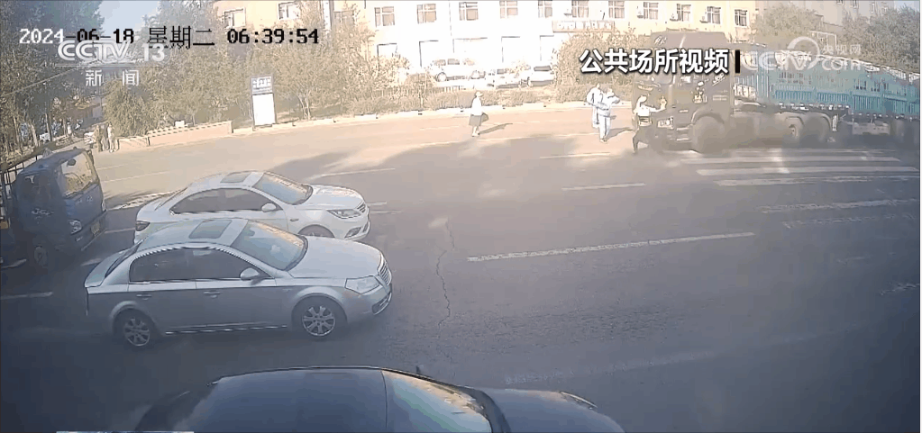 視頻顯示,6月18日早上6點(diǎn)40分左右,輔警陳作兵在長(zhǎng)春市第一O六中學(xué)校門(mén)前執(zhí)勤。突然,一輛大貨車(chē)從遠(yuǎn)處駛來(lái),不斷鳴笛。眼看就要經(jīng)過(guò)斑馬線(xiàn)卻沒(méi)有及時(shí)減速,此時(shí)學(xué)生和家長(zhǎng)正要過(guò)馬路。陳作兵看到后,立即截停車(chē)輛,貨車(chē)剎車(chē)后由于慣性將他撞得連連后退。