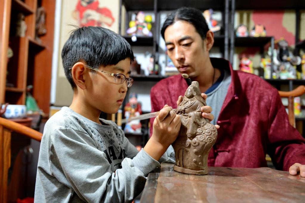 2014年10月22日,“三癡齋”泥塑傳承人宋長(zhǎng)峰指導(dǎo)兒子進(jìn)行泥塑制作。
