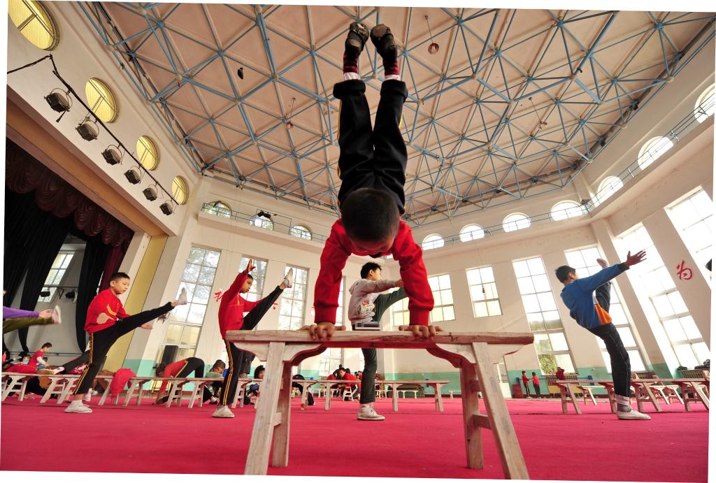 2014年10月24日,吳橋國(guó)際雜技藝術(shù)學(xué)校的學(xué)生們?cè)诰毠Α?/p>