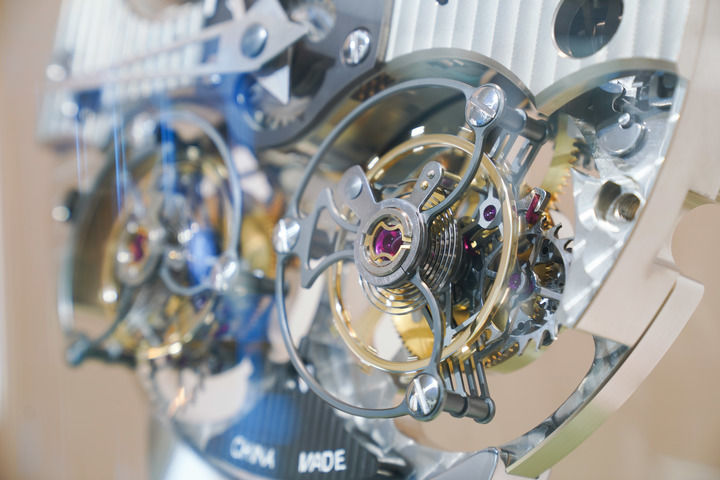 在位于遼寧丹東的孔雀表業(yè)(集團(tuán))有限公司展示中心拍攝的雙陀飛輪機(jī)芯模型(6月18日攝)。新華社記者 樊雨晴 攝