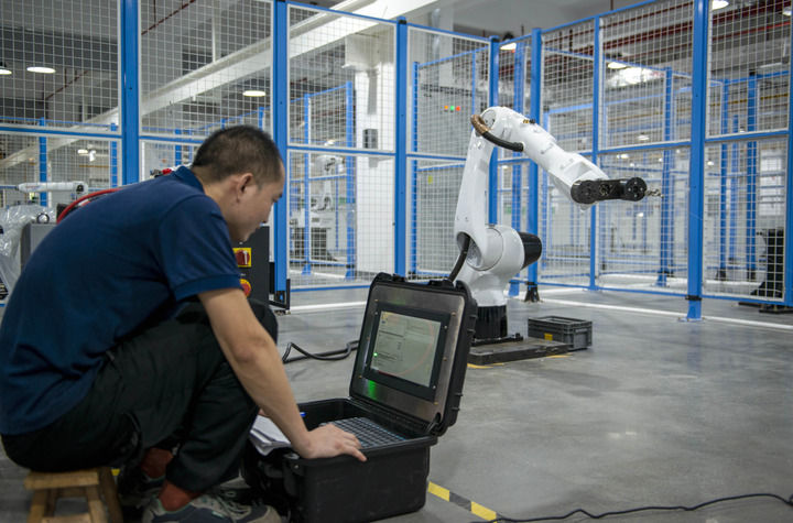 在廣東拓斯達(dá)科技股份有限公司,工作人員對(duì)一臺(tái)工業(yè)機(jī)器人進(jìn)行絕對(duì)定位精度的校準(zhǔn)(5月17日攝)。新華社記者 徐嘉懿 攝