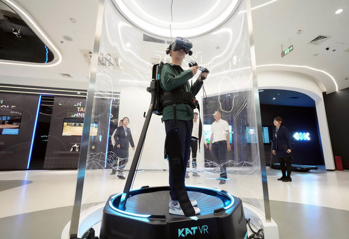 在位于江蘇蘇州昆山市的昆山元宇宙產(chǎn)業(yè)園元宇宙展示廳里,參觀者體驗(yàn)VR游戲(6月1日攝)。新華社記者 李尕 攝
