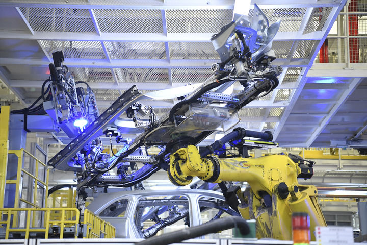 江蘇常州理想汽車智能制造基地焊裝車間的機(jī)械臂正在作業(yè)(5月31日攝)。新華社記者 柳文惠 攝