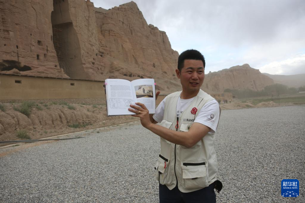 6月15日,在阿富汗巴米揚(yáng)省的巴米揚(yáng)大佛遺址區(qū),中國(guó)學(xué)者邵學(xué)成展示書中記載的巴米揚(yáng)大佛相關(guān)內(nèi)容。新華社發(fā)(塞夫拉赫曼·薩菲攝)