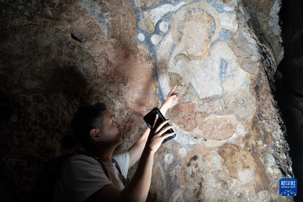 6月15日,在阿富汗巴米揚(yáng)省,中國(guó)學(xué)者邵學(xué)成在一處石窟中觀察壁畫。新華社記者 趙家淞 攝