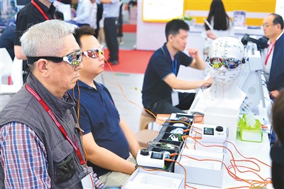 圖為近日,觀眾在第十屆中國國際養(yǎng)老服務(wù)業(yè)博覽會上體驗“多效經(jīng)穴激活治療儀”。