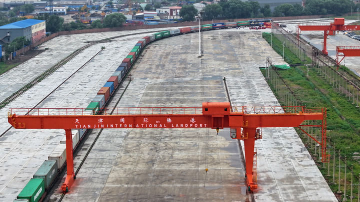 7月1日在天津國際陸港拍攝的準(zhǔn)備發(fā)車的中歐班列(無人機照片)。新華社記者李然攝