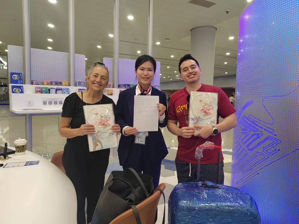上海浦東機場T2航站樓的外籍人員一站式綜合服務中心近日建成投用,按照支付、文旅、通信、交通四個模塊功能,為外籍人員提供便利化服務。南非游客艾利克斯在此辦理短期通信卡后寫下留言:“中國讓入境游客體驗到更多便利,這讓我們非常開心。上海電信的工作人員還送上兩把中國扇子用以緩解暑熱。”