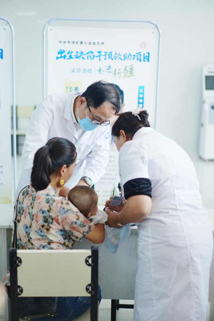 2023年8月,新疆和田縣人民醫(yī)院,專家正在為當?shù)氐某錾毕莼純毫x診。(中國出生缺陷干預(yù)救助基金會供圖)
