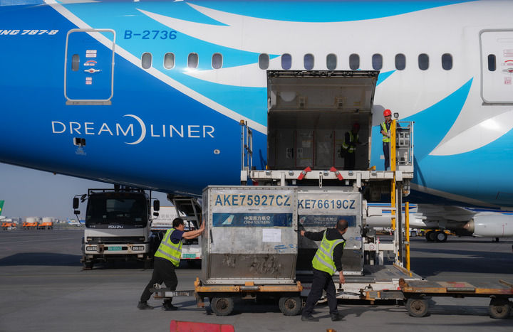 南航工作人員在烏魯木齊地窩堡國際機場裝卸國際航班貨物(2024年4月28日攝)。新華社發(fā)(車捷 攝)
