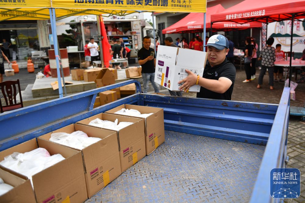 7月10日,在岳陽(yáng)市良心堡鎮(zhèn)望君洲村,志愿者在打包盒飯。新華社記者 陳思汗 攝