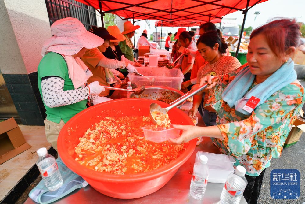 在岳陽(yáng)市良心堡鎮(zhèn)望君洲村,志愿者在打包飯菜(7月8日攝)。新華社記者 陳澤國(guó) 攝