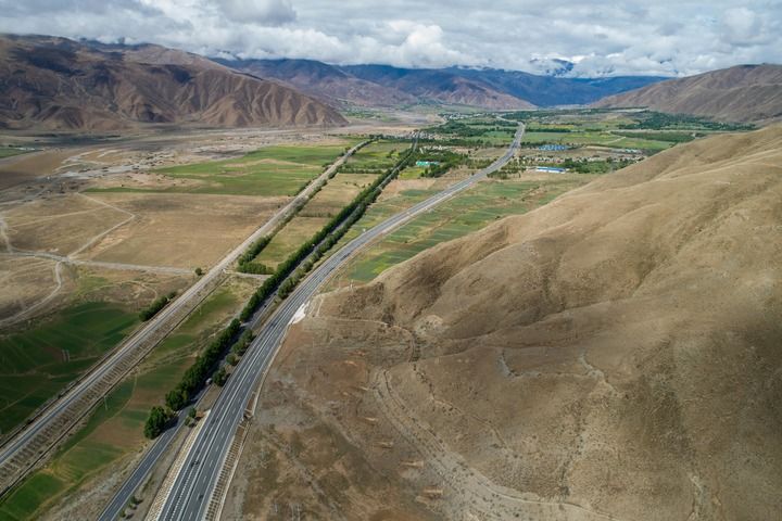 俯瞰西藏拉薩市至日喀則市區(qū)間的交通網(wǎng)絡(luò),從左至右依次為農(nóng)村公路、鐵路、國(guó)道和高等級(jí)公路(2024年6月27日攝,無(wú)人機(jī)照片)。