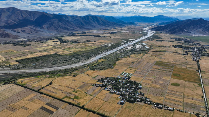 西藏日喀則市年楚河流域縱橫交錯(cuò)的鄉(xiāng)村道路(2023年9月6日攝,無(wú)人機(jī)照片)。新華社記者 晉美多吉 攝