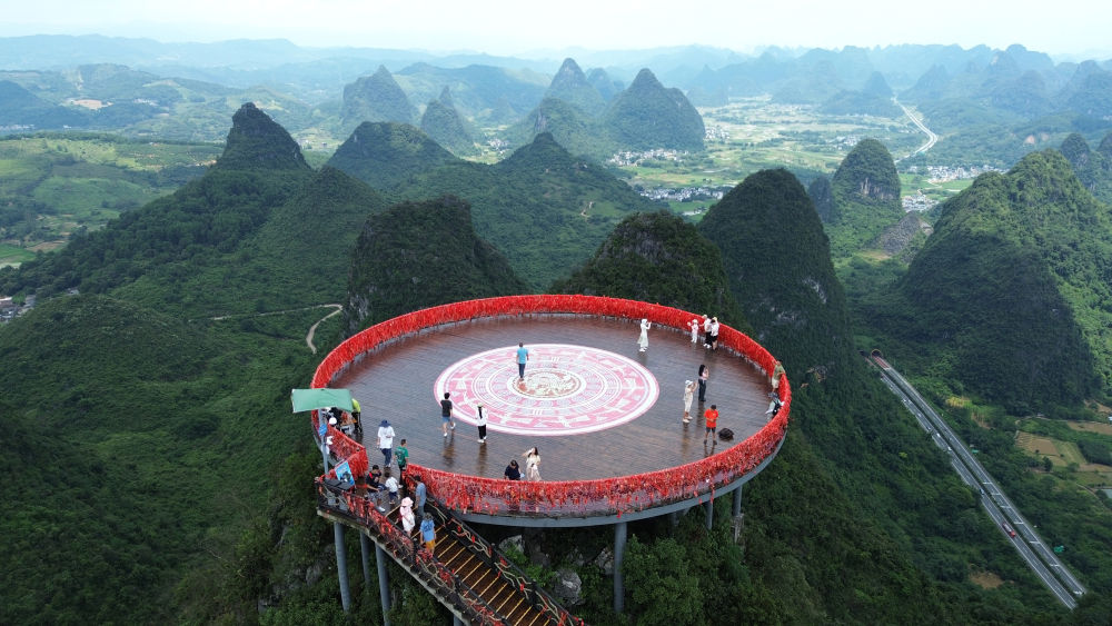 7月13日,游客在廣西桂林市陽(yáng)朔縣如意峰觀景(無(wú)人機(jī)照片)。新華社發(fā)(廖祖平攝)