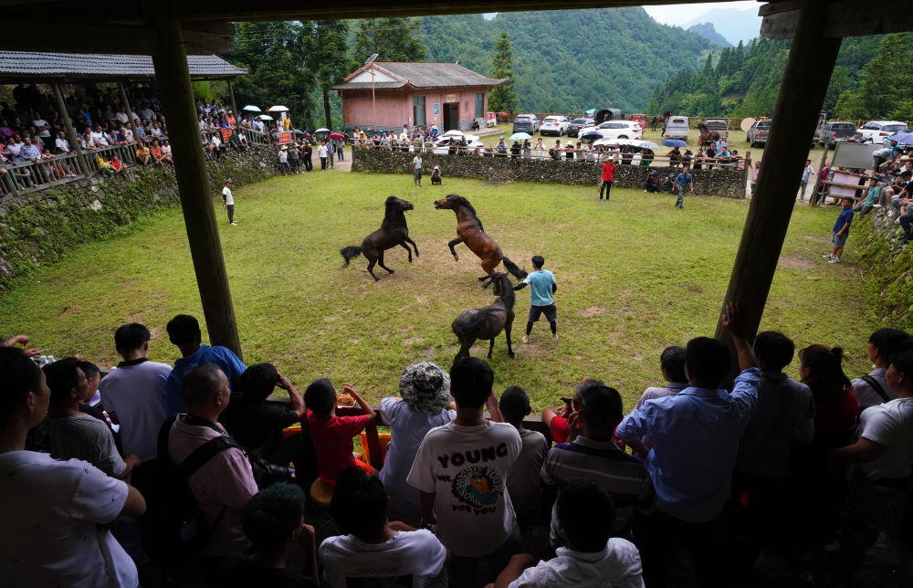 7月13日,游客騎馬游覽甘肅省張掖市民樂(lè)縣扁都口生態(tài)景區(qū)油菜花海。新華社發(fā)(成林?jǐn)z)