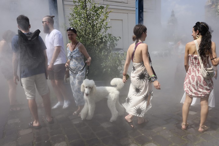 7月11日,在匈牙利布達(dá)佩斯,人們?cè)趪婌F裝置中感受清涼一刻。新華社發(fā)(弗爾季·奧蒂洛攝)