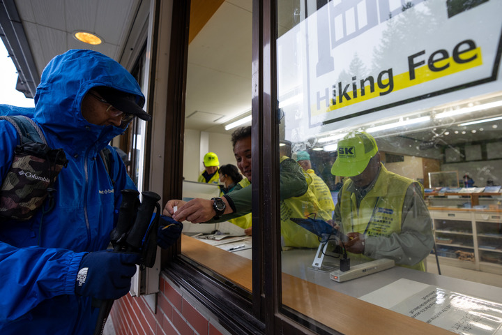 7月1日,在日本山梨縣富士山吉田路線五合目登山口購票處,工作人員為游客戴上象征已支付登山通行費(fèi)的腕帶。新華社記者張笑宇攝