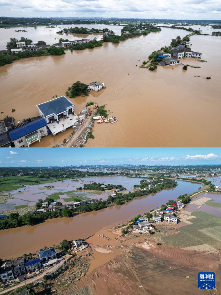 拼版照片:上圖為7月29日12時拍攝的湖南省湘潭縣易俗河鎮(zhèn)四新堤決口現(xiàn)場(無人機照片);下圖為7月30日16時拍攝的湖南省湘潭縣易俗河鎮(zhèn)四新堤決口現(xiàn)場(無人機照片)。新華社記者 陳思汗 攝