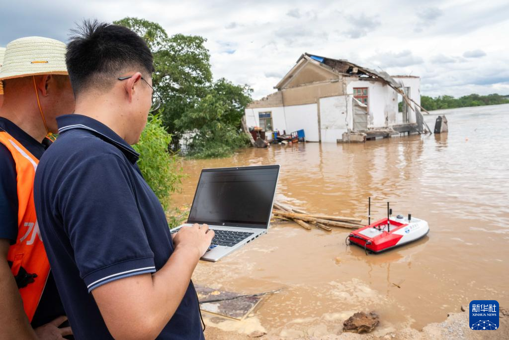 7月29日,在湖南省湘潭縣易俗河鎮(zhèn)四新堤決口現(xiàn)場,水利部門工作人員在測量決口附近的水深、流速等信息。新華社記者 陳思汗 攝
