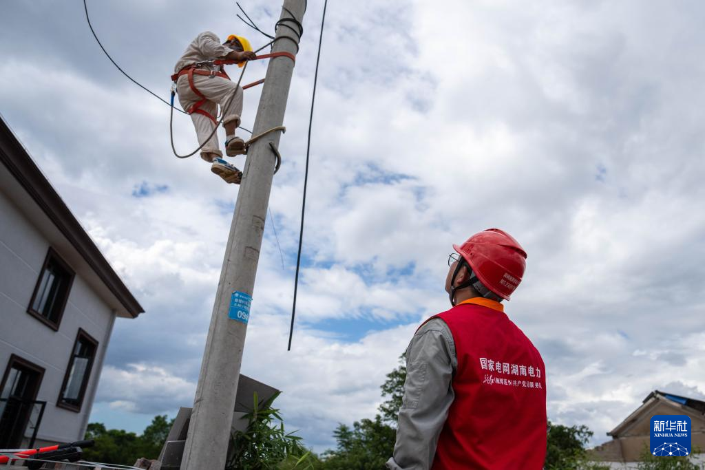 7月29日,在湖南省湘潭縣易俗河鎮(zhèn)四新堤決口現(xiàn)場,搶險人員在處理決口附近的電線。新華社記者 陳思汗 攝