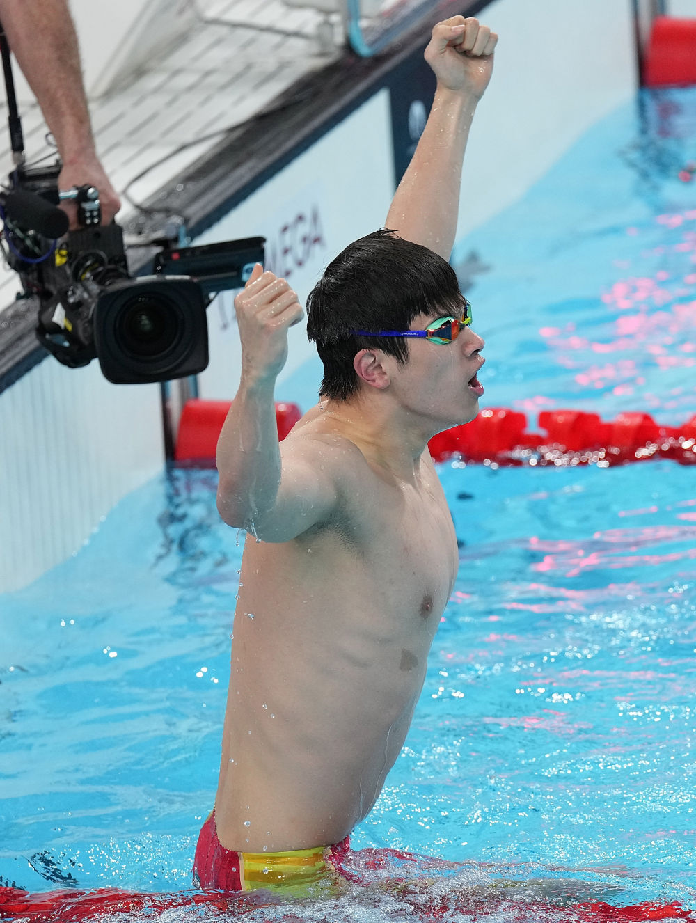 ↑中國選手潘展樂在比賽后慶祝。新華社記者 薛宇舸 攝