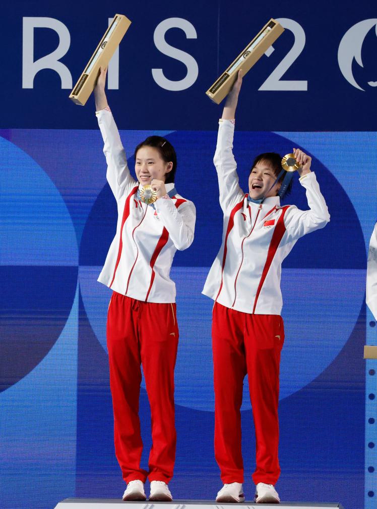 7月31日,冠軍中國選手陳芋汐(左)/全紅嬋在頒獎儀式上。新華社記者 張玉薇 攝