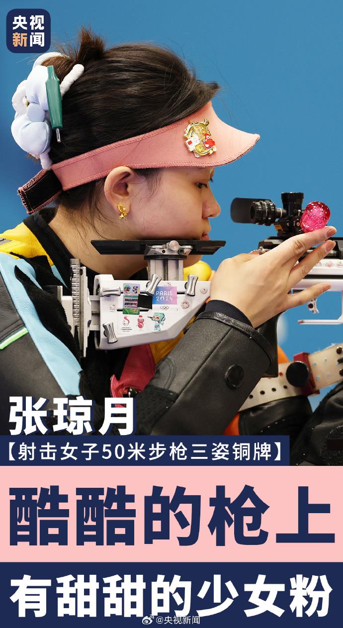 8月2日,在巴黎奧運(yùn)會(huì)射擊女子50米步槍三姿決賽中,中國(guó)選手張瓊月奪得銅牌。戴著粉色帽子的張瓊月,步槍上貼滿可愛的Hello Kitty貼紙,用最萌的裝備打最穩(wěn)的槍!