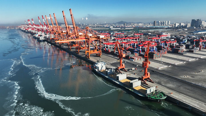 貨船在遼寧營口港碼頭裝運(yùn)糧食(2024年1月10日攝,無人機(jī)照片)。