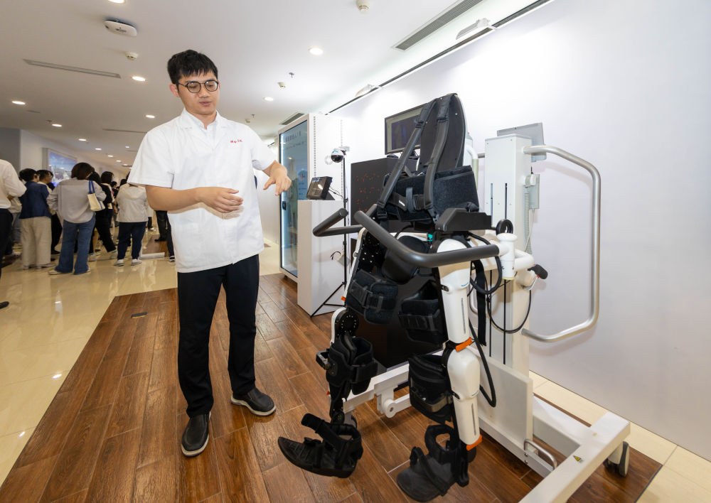 2024年5月24日,在位于上海市嘉定區(qū)的上海交通大學(xué)醫(yī)學(xué)院附屬瑞金醫(yī)院腫瘤質(zhì)子中心,工作人員介紹由瑞金醫(yī)院醫(yī)生和醫(yī)療公司共同研發(fā)的用于恢復(fù)患者下肢的醫(yī)療機器人。新華社記者 王翔 攝
