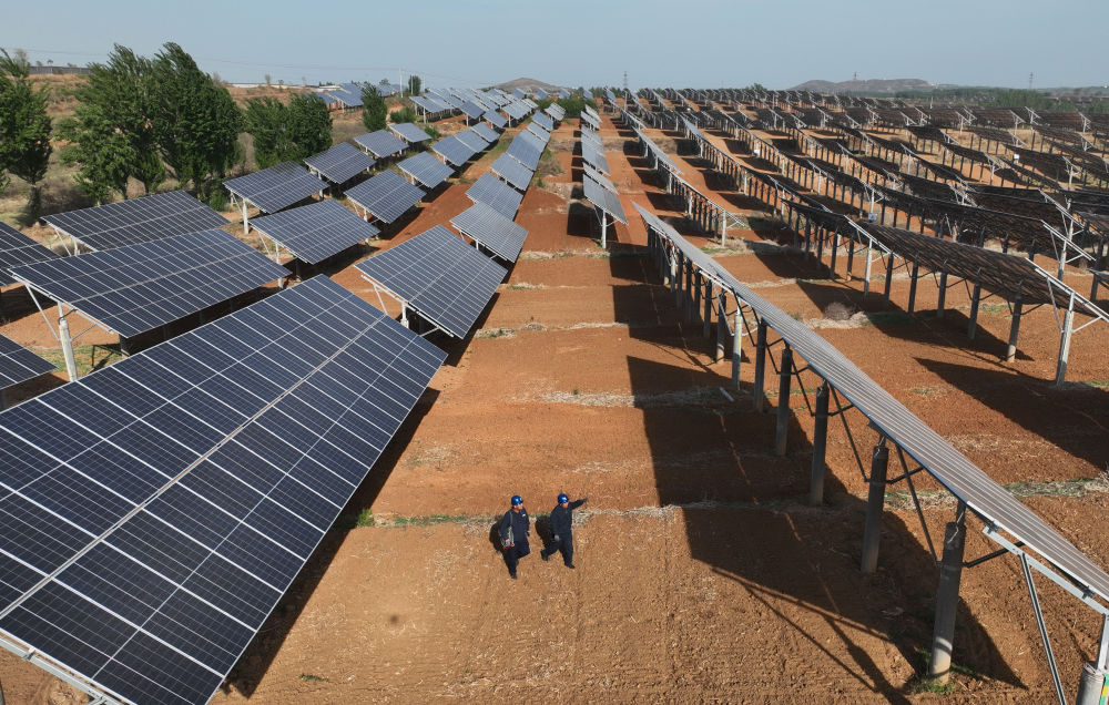 2024年4月16日,工人在河北省石家莊市靈壽縣譚莊鄉(xiāng)程家莊村的“農(nóng)光互補”光伏發(fā)電場巡查(無人機照片)。新華社記者 楊世堯 攝