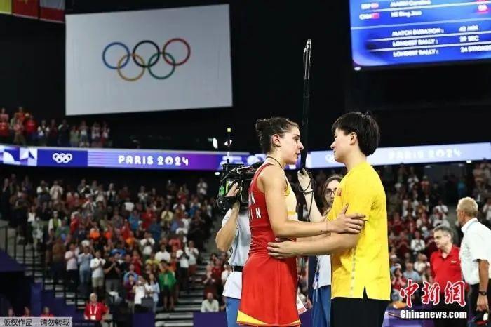 面對痛苦跪地、嚎啕大哭的馬林,何冰嬌主動走上前,用一個溫暖的擁抱給予對手安慰與尊重,展現(xiàn)出中國運動員的風度和胸襟。