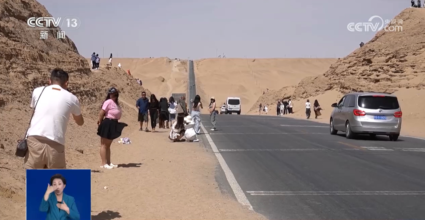 而在格爾木市G315國(guó)道一處網(wǎng)紅“U”型路段,由于該路段落差大、跨度遠(yuǎn)、戈壁景色壯觀,有游客不僅將車(chē)隨意停在路邊,還不顧往來(lái)車(chē)流橫穿公路,甚至有人就站在道路中間拍照。