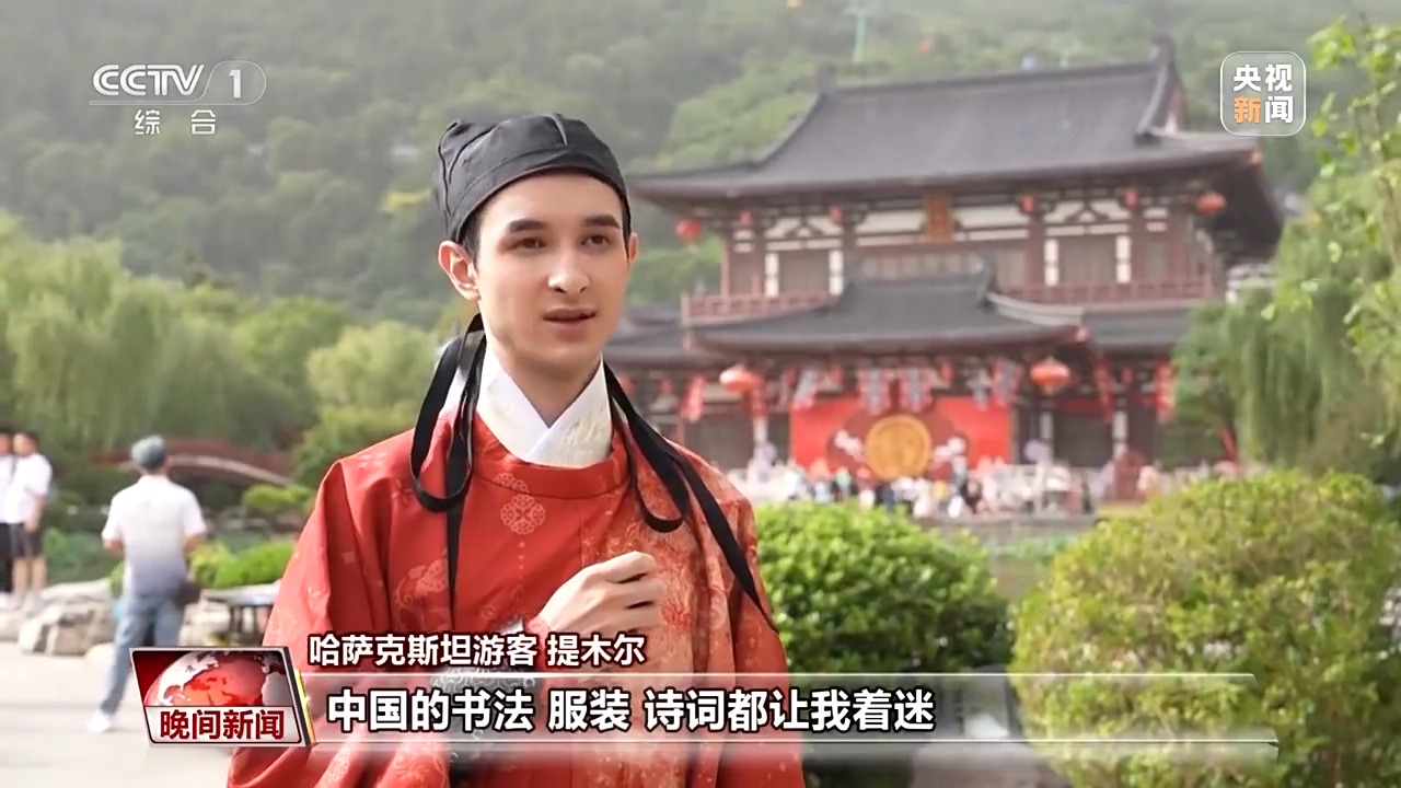 哈薩克斯坦游客提木爾:中國的書法、服裝、詩詞都讓我著迷,今天穿著這身中國的傳統(tǒng)服飾,體驗中國唐代的宮廷婚禮,這個經(jīng)歷真的太獨特,太珍貴了。
