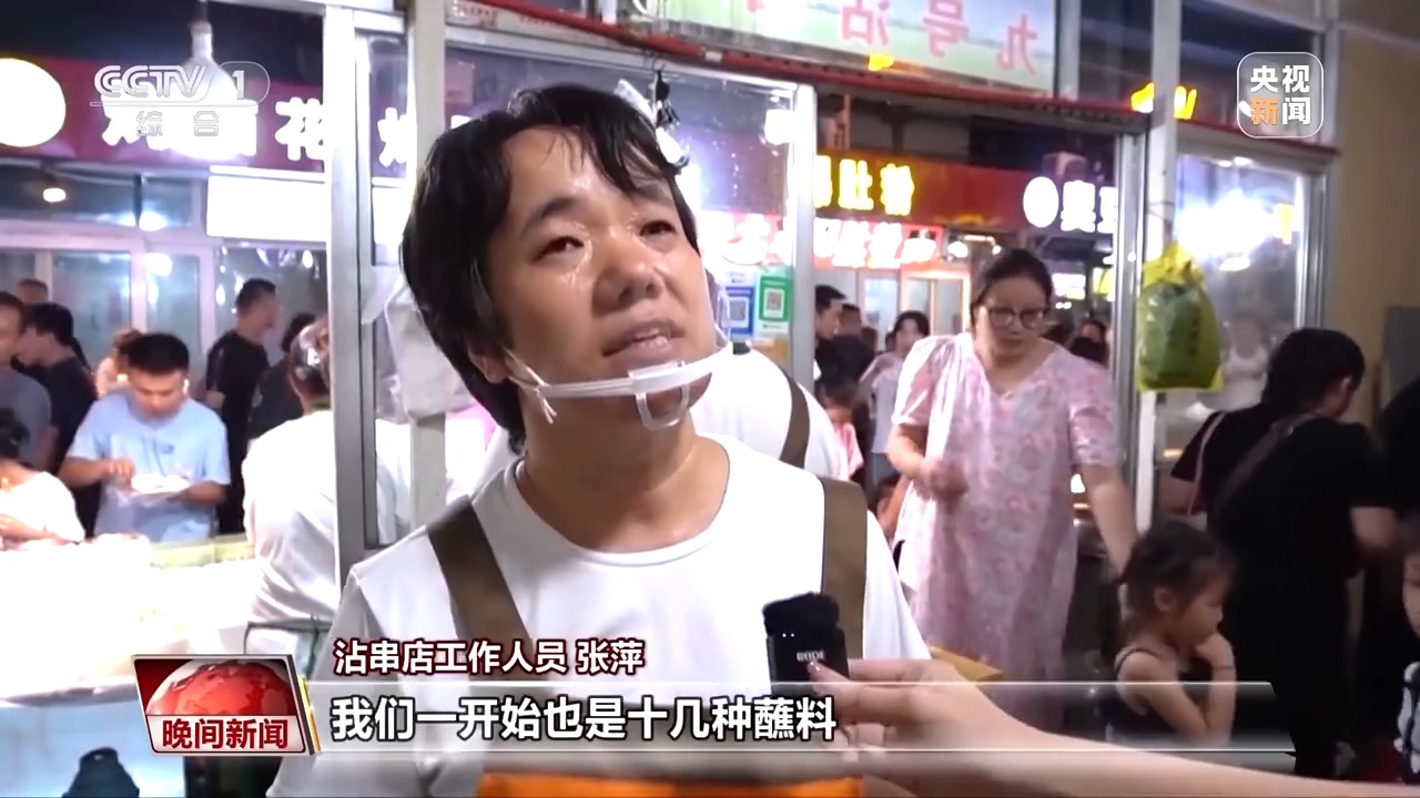 沾串店工作人員 張萍:干了到現(xiàn)在已經(jīng)有十幾年了,我們一開始也是十幾種蘸料,每年都更新,都在增加中。一天賣個3000串左右,一天大概有30多壺醬料。