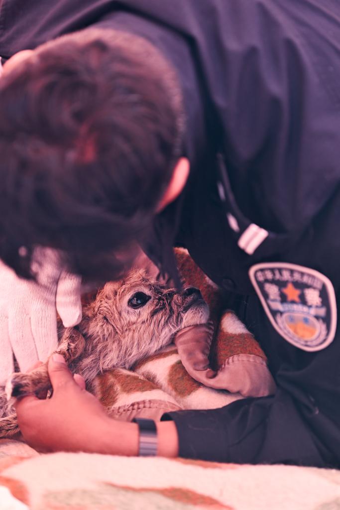 很難想象,這些面龐黝黑、身材魁梧的藏族漢子會(huì)趴在一只小藏羚羊身邊,一邊輕柔地給它擦拭身體,一邊像安撫哭鬧的孩子一樣,輕聲細(xì)語地告訴它:“不要害怕,我們來救你了”。