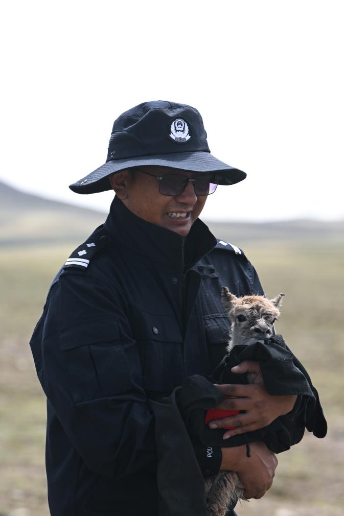這時(shí),可可西里森林公安局輔警尼瑪扎西接過了多結(jié)仁欠懷里的小藏羚羊。小藏羚羊渾身濕漉漉的,不停地發(fā)抖。尼瑪扎西隨即脫下自己的衣服,一邊給小藏羚羊擦身體,一邊溫柔地說:“你的媽媽找不到了,我們來當(dāng)你的媽媽。”