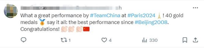 “中國隊在2024巴黎奧運會上的表現(xiàn)太棒了!40枚金牌收官,這是自2008年北京奧運會以來中國隊的最佳表現(xiàn)。恭喜!”