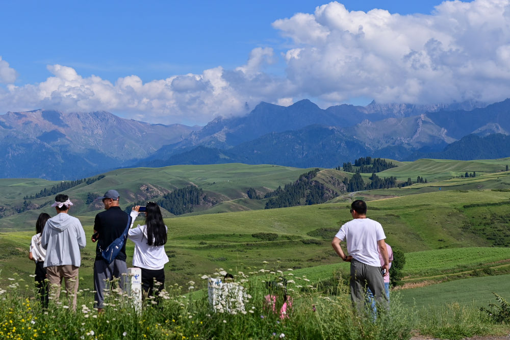 7月10日,在新疆昌吉回族自治州奇臺縣江布拉克景區(qū),游客在拍攝萬畝小麥旱田景觀。新華社記者 丁磊 攝