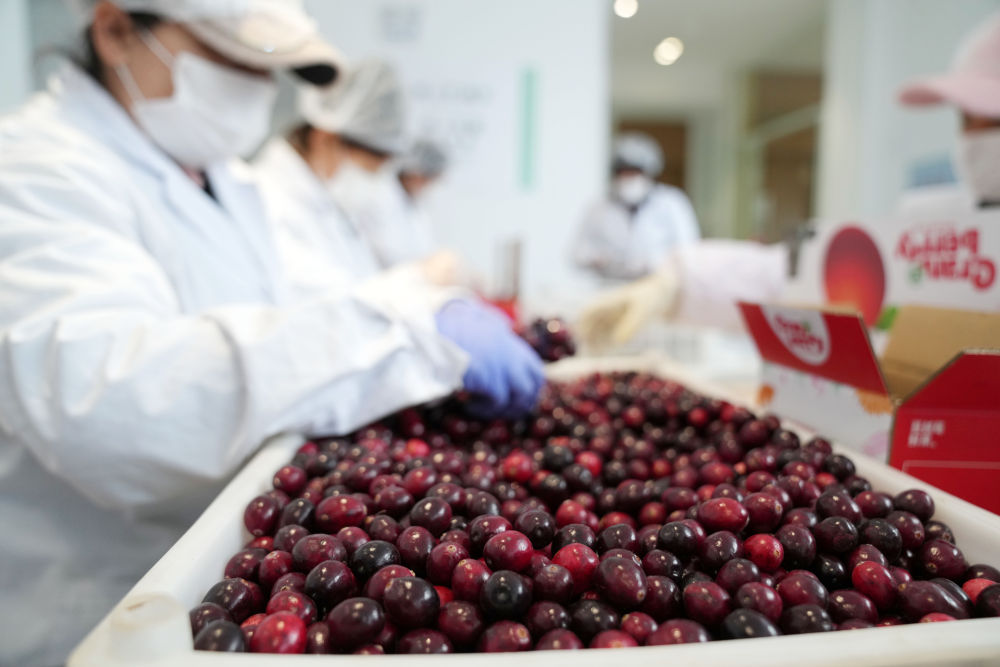 1月29日,在黑龍江省撫遠(yuǎn)市蔓越梅種植基地,工作人員分揀蔓越莓鮮果。新華社記者 王建威 攝