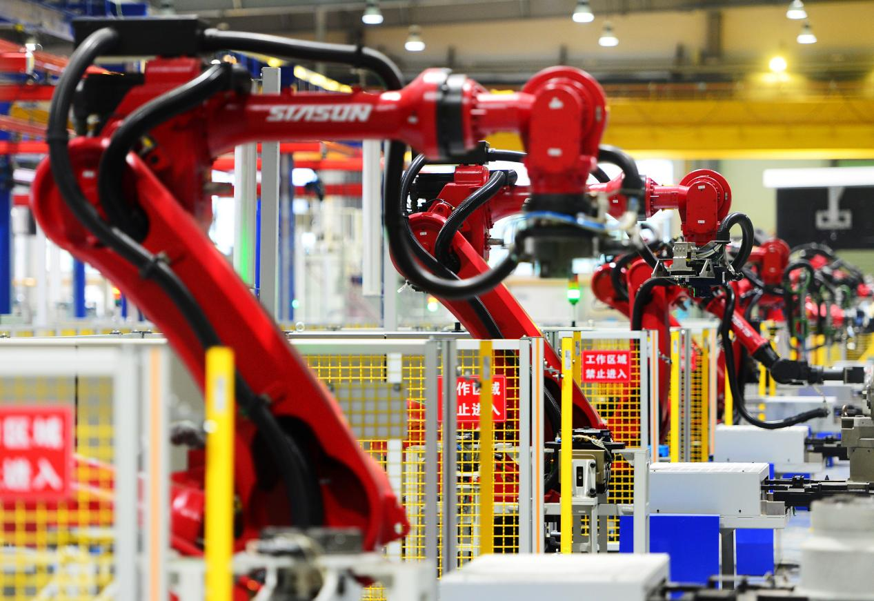 在某工業(yè)機(jī)器人生產(chǎn)線,機(jī)器人正在自主地抓取各種零部件,快速組裝稍小的工業(yè)機(jī)器人。
