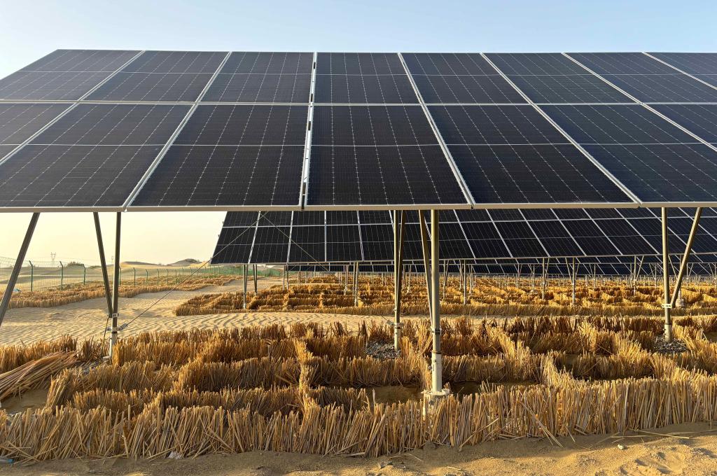 從新疆庫爾勒市出發(fā),沿著烏若高速向東南方向駛?cè)搿八劳鲋!薄死敻缮衬沟?,寫著“沙戈荒光伏生態(tài)治沙示范項(xiàng)目”大字的一座光伏電站映入眼簾。光伏板下及光伏電站外圍,青黃色的蘆葦稈扎入沙中構(gòu)成“圍棋盤”式的草方格,將黃沙牢牢包圍。
