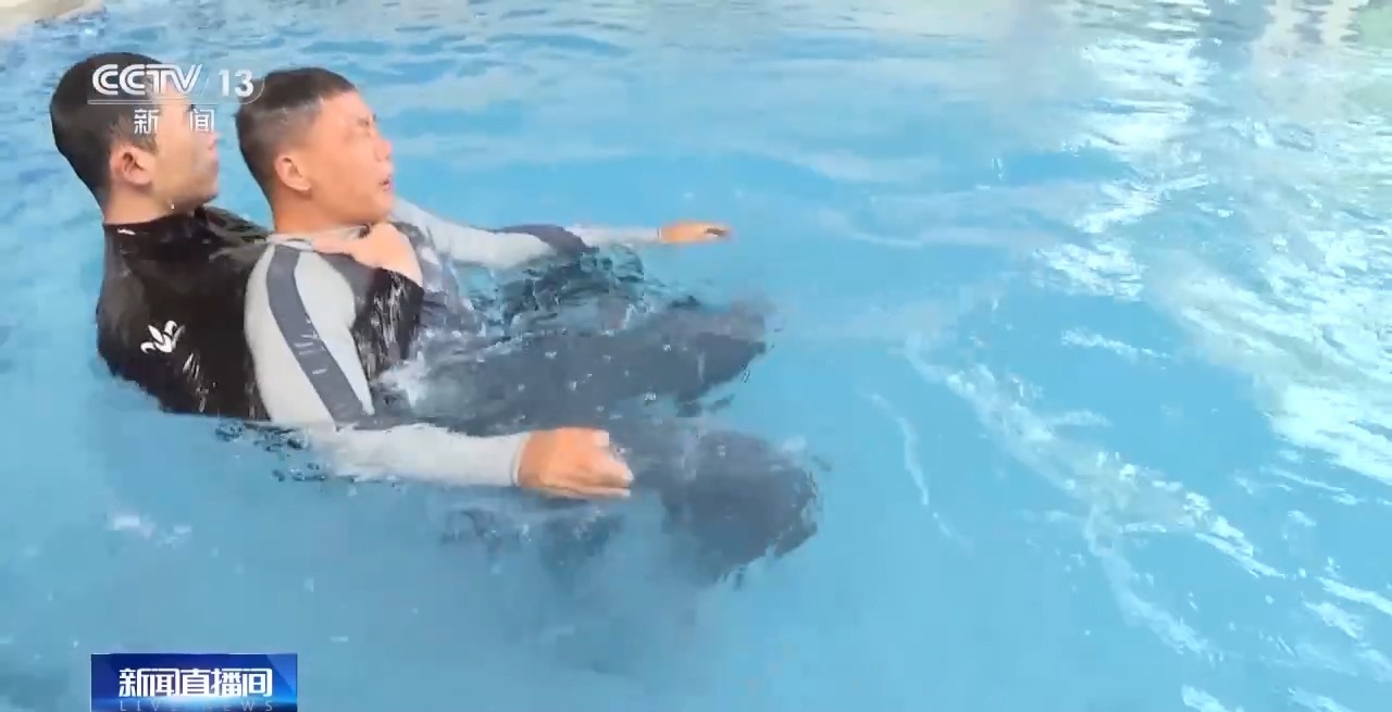 國家消防救援局水域救援訓練基地教練員 李勝龍:我們不要正面游向他,要盡量從他的背后,然后靠近他的時候要轉動他的髖部,使他背向我,因為溺水者他在慌亂的時候會抓緊我們的身體,也就是我們俗稱的“抓緊最后一根稻草”。他會死死抓住我們,影響我們的救援,所以說我們要從背后接近他,然后托住他的頭部 、頸部,使他的頭部始終露出水面,降低他的恐慌。