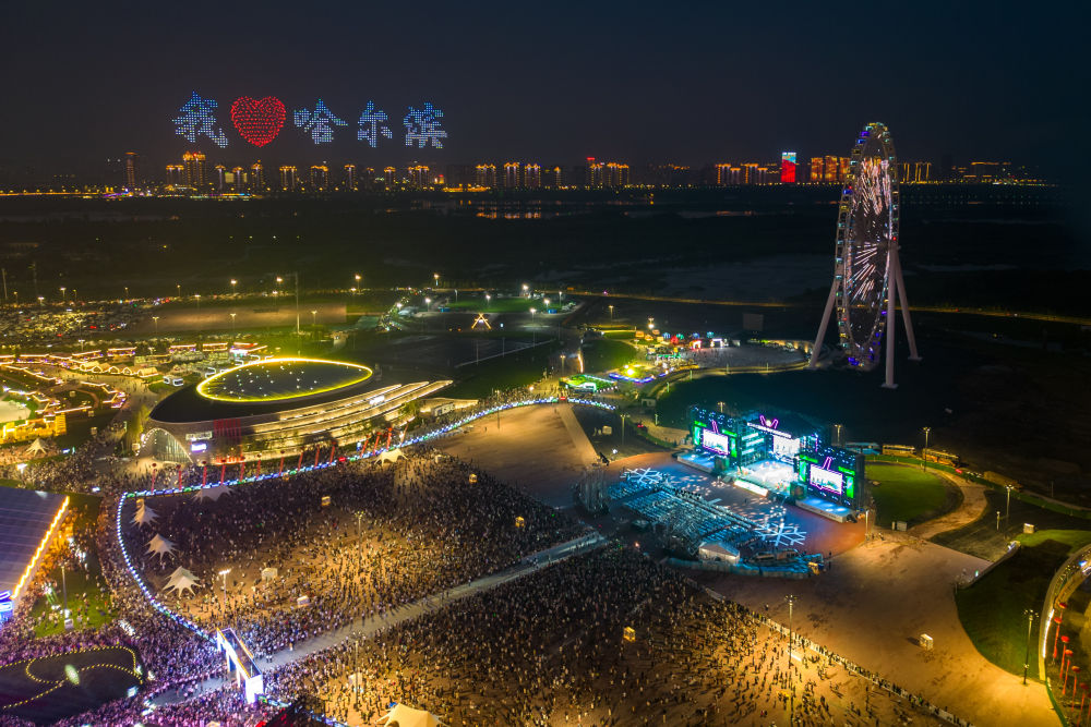 人們在哈爾濱國際啤酒節(jié)現(xiàn)場觀看無人機(jī)表演。新華社記者 張濤 攝