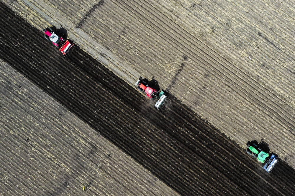2024年6月25日,大型農(nóng)機在黑龍江北大荒集團鶴山農(nóng)場作業(yè),為土壤增溫放寒(無人機照片)。今年,黑龍江推進高標準農(nóng)田建設(shè)、侵蝕溝治理和農(nóng)田防護林更新修復(fù)一體化實施,建設(shè)高標準農(nóng)田1400萬畝、治理侵蝕溝1.2萬條,全面加強黑土地保護利用。