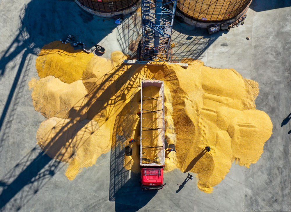 2023年10月15日,司機駕駛運糧車在內(nèi)蒙古通遼市科爾沁左翼中旗腰林毛都鎮(zhèn)收糧站卸糧(無人機照片)。