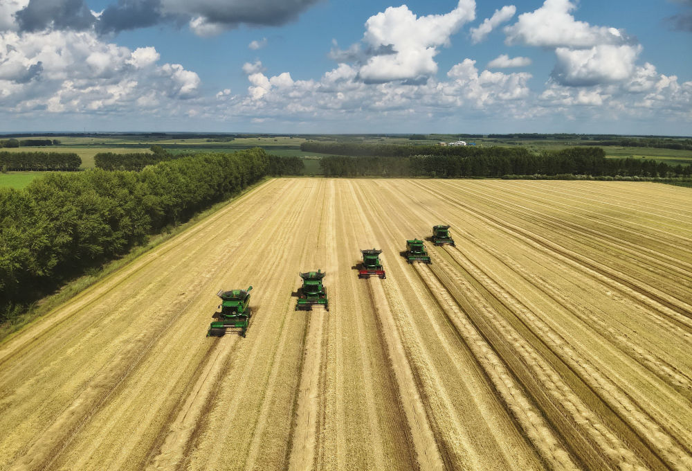 2024年8月9日,農(nóng)機在北大荒集團黑龍江紅星農(nóng)場有限公司田間收獲小麥(無人機照片)。截至2023年,北大荒集團農(nóng)業(yè)科技進步貢獻率達到77.07%,農(nóng)業(yè)綜合機械化率達到99.7%。
